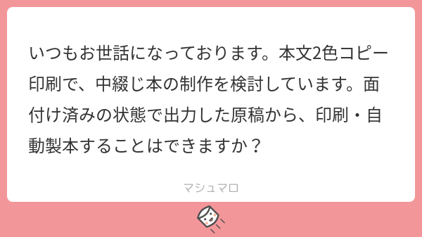 秋葉原制作所 もちろん2色コピーを使用した全自動中とじ製本も可能です 原稿データは 1pずつの単ページ原稿データ 面付け 済の原稿データ 面付けの組み合わせミスにお気をつけくださ のどちらでもokです マシュマロを投げ合おう T Co